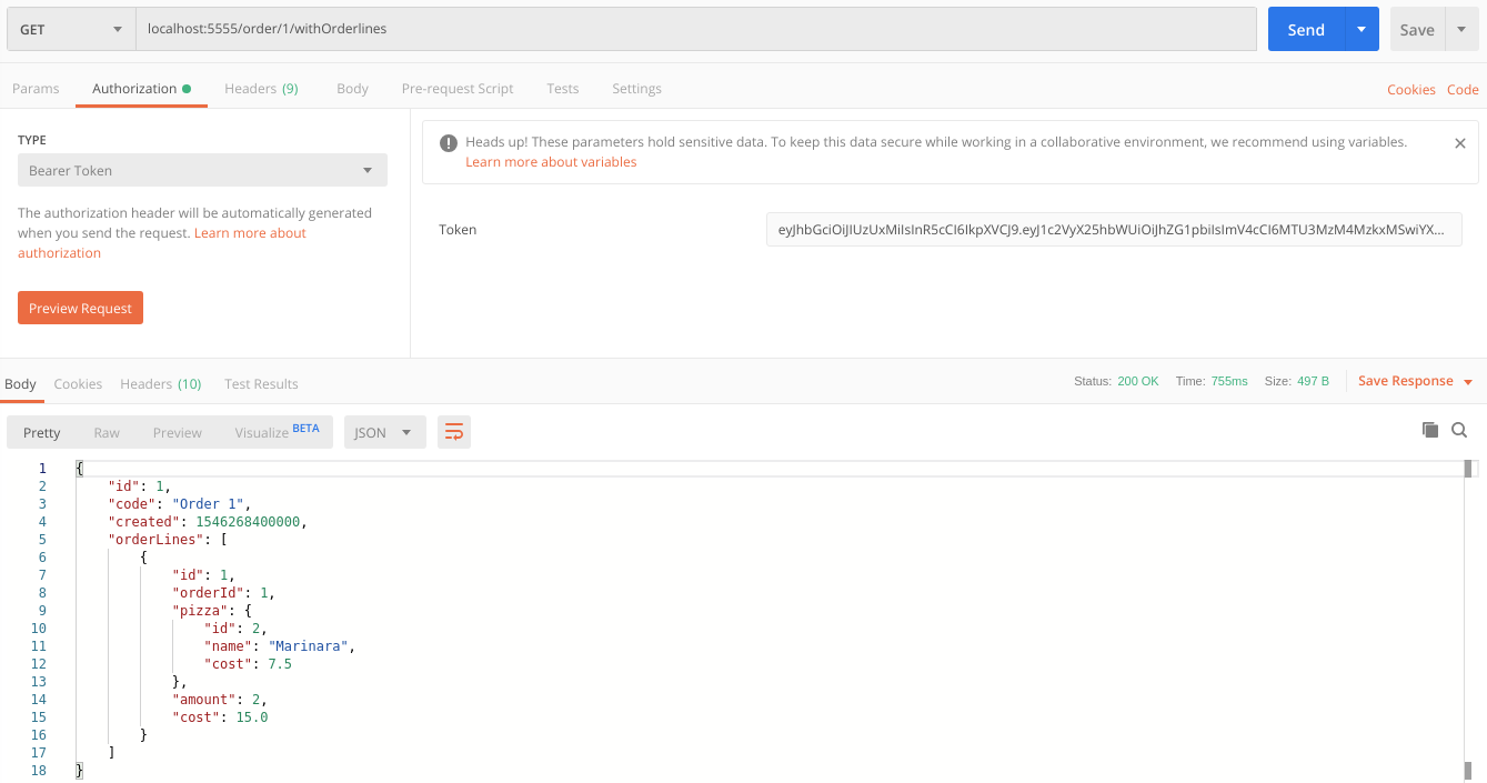 One order has several order lines and one order line contains a pizza. The main purpose of this microservice is the creation of an small one on which I am using the following technologies: