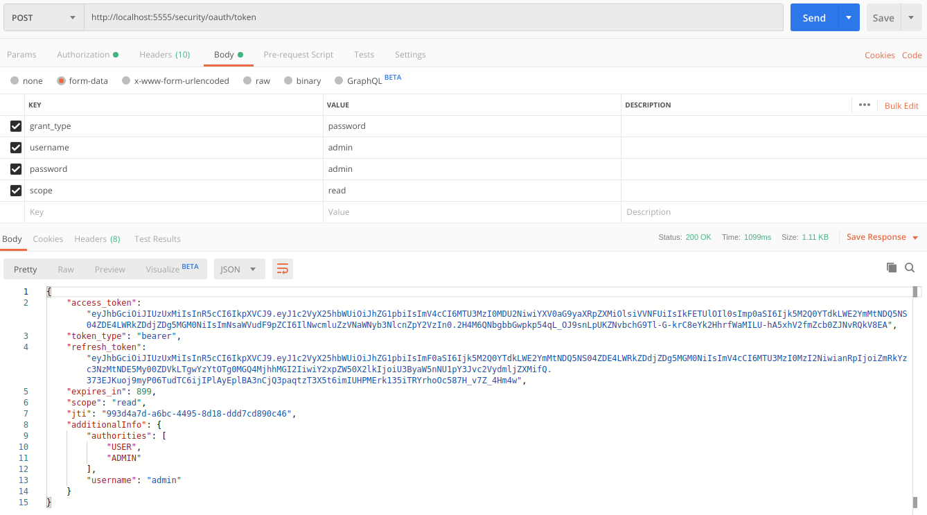 Full integration with Oauth 2.0 + Jwt functionality provided by Spring, used to have an option to manage authentication/authorization functionalities through access and refresh tokens. With this microservice working as Oauth server we will be able to configure the details of every allowed application using the table in database: security.oauth_client_details. On the other hand, several customizations have been included to the manage the creation of both JWT tokens and how to append additional information too.