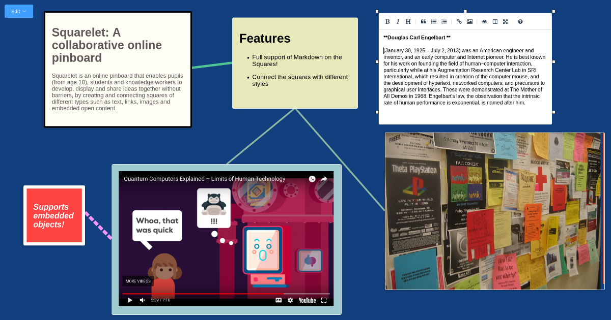 Squarelet is an online pinboard that enables pupils (from age 10), students and knowledge workers to develop, display and share ideas together without barriers, by creating and connecting squares of different types such as text, links, images and embedded open content.