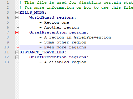 You can see that the DISTANCE_TRAVELLED stat will not be updated whenever a player is in a WorldGuard region called 'TestRegion' or 'Lala'. Similarly, this stat will not be updated whenever a player is in the GriefPrevention claim area that corresponds to one of those UUIDs.