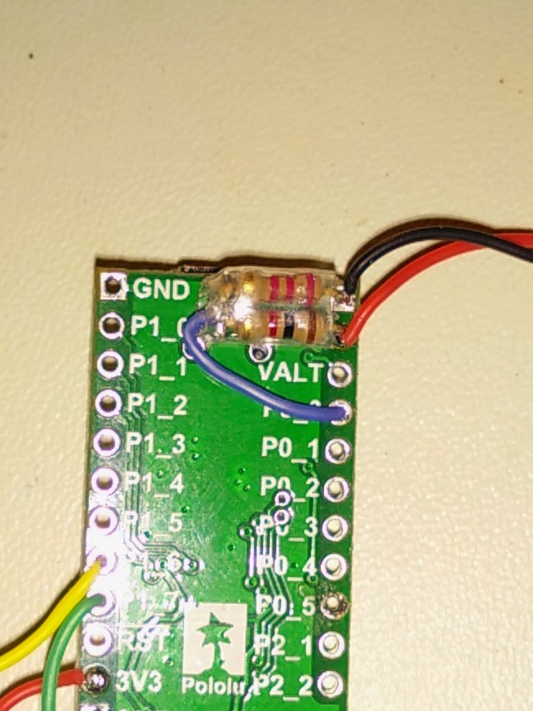 - You'll need a 1/4w 1K Ohm and a 1/4w 2.2K Ohm resistor. 1/8w should work, and be smaller, but it hasn't been tested