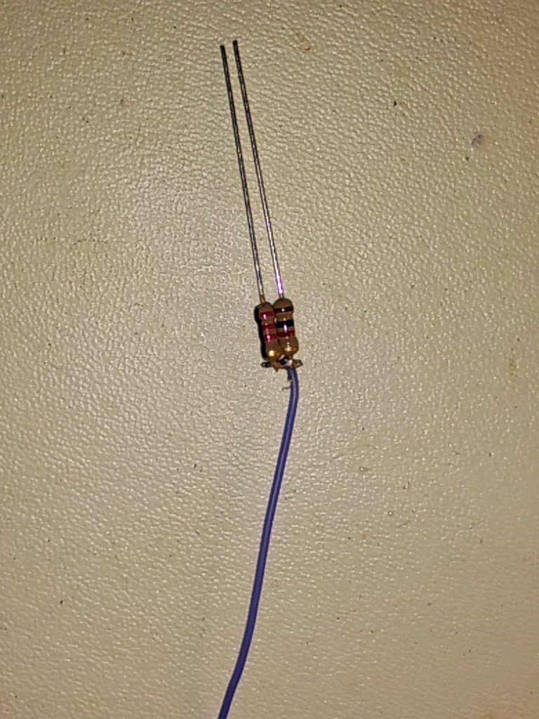 - Trim the leads of the 90 degree bend so they are flush with the resistors and trim any excess exposed wire from the piece you added to prevent any possible shorts.