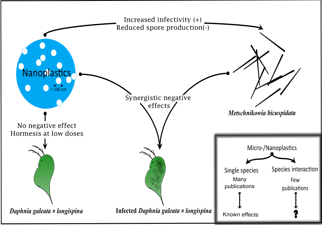 Widely abundant micro- and nanoplastics pose a threat for aquatic ecosystems. Despite the extensive knowledge on their effects at the species level, however, the way they affect interactions between species remains largely unexplored. We studied the effects of polystyrene nanoplastic beads (100 nm) on host-parasite interactions by exposing the waterflea Daphnia galeata × longispina to the virulent parasitic yeast Metschnikowia bicuspidata, under two different nanoplastic concentrations: 5 and 20 mg/L. Both concentrations of nanoplastics increased the proportion of infected hosts; at the highest concentration, however, elevated rates of host mortality and lower spore production cancelled out the parasite’s advantage. Thus, parasite success was highest greatest at the low est levels of nanoplastic contamination. Given that parasitism is an ubiquitous lifestyle in nature, and that parasites can play important roles in the shaping and functioning of ecosystems, these results highlight the importance of including interactions between host species and their parasites as alternative ecotoxicological endpoints to better assess the ecological consequences of plastic pollution.