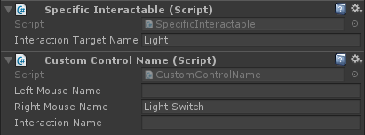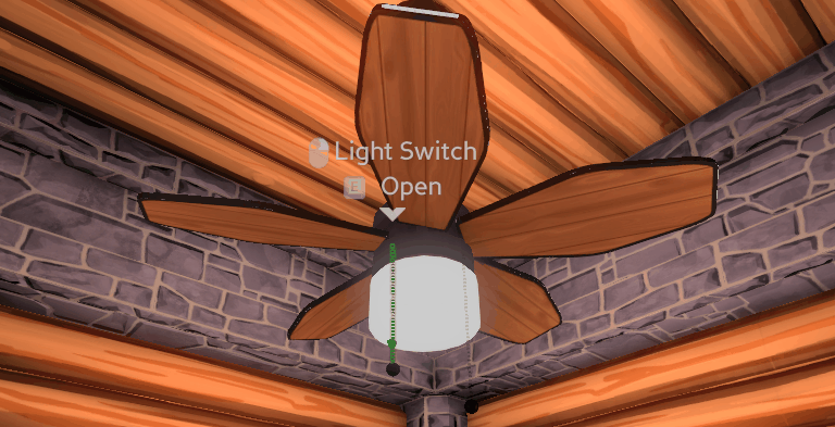 • On the chains add a SpecificInteractable component using the same strings from the server code. Now interacting with these colliders will send those strings to the server to toggle light/fan state. Also add a CustomControlName component to display which interactions work and what each switch does. Set one to "Light" and the other "Fan"