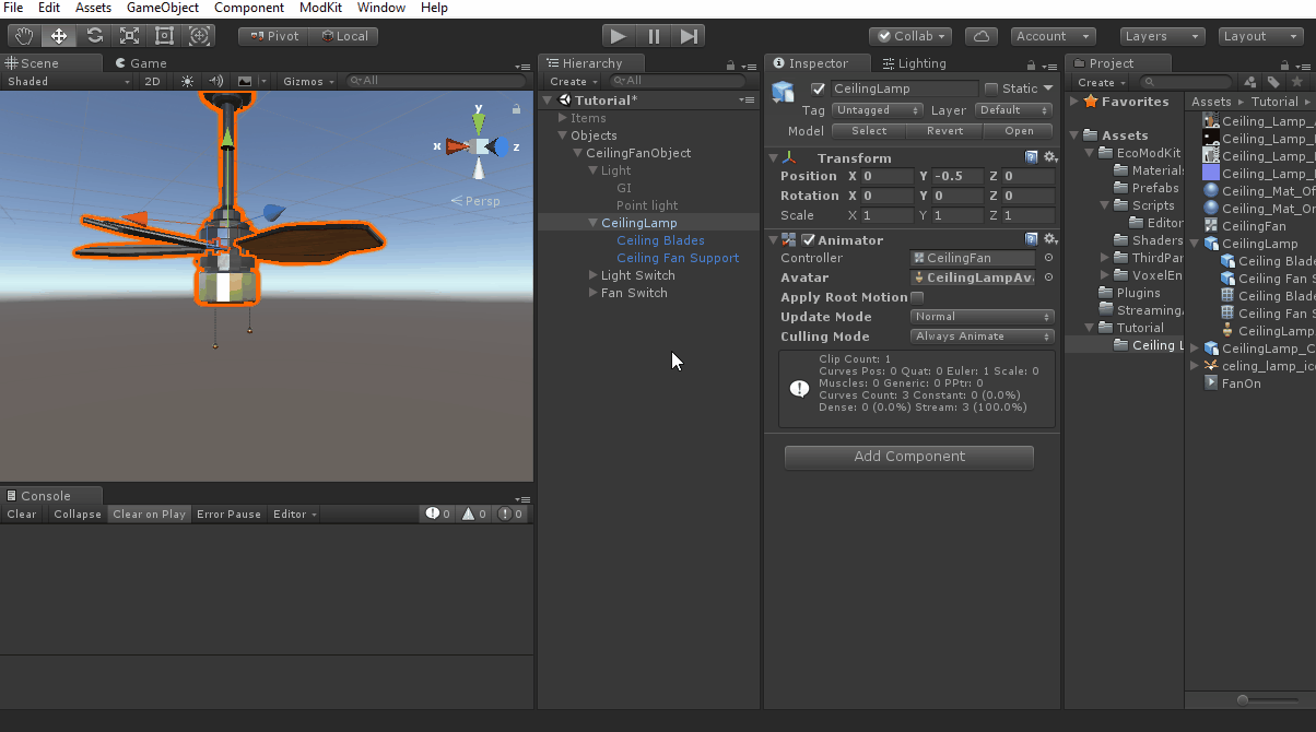 • Select the CeilingLamp in the Hierarchy tab and add a Animator component if it doesn't already have one. Then assign the Avatar from the model and drag the new animation controller into the controller slot.