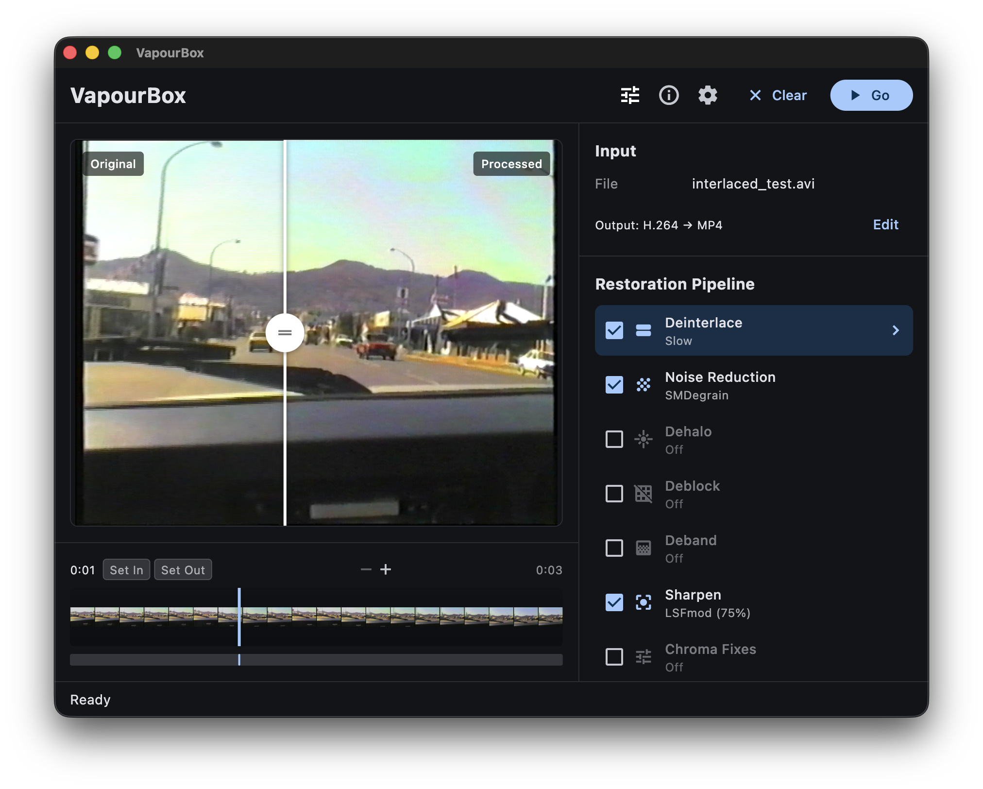 - Multi-pass restoration pipeline - Denoise, sharpen, dehalo, deblock, deband