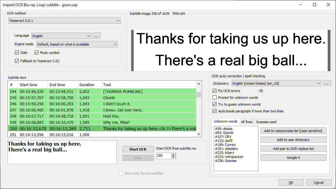 Hi Nik, sorry for the long delay. I've been OCRing again recently and hit a few pipes in The Goonies (UHD), sup attached: |