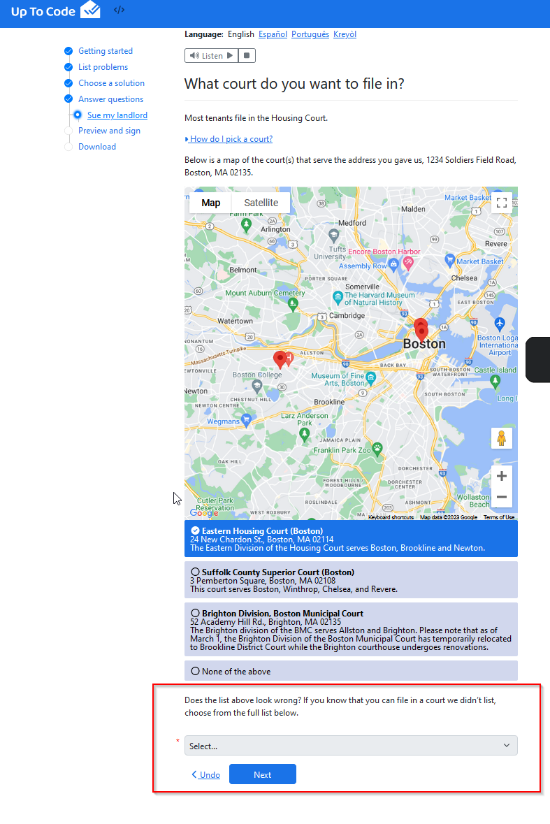 the list of all courts should only show up if the user has selected "None"
