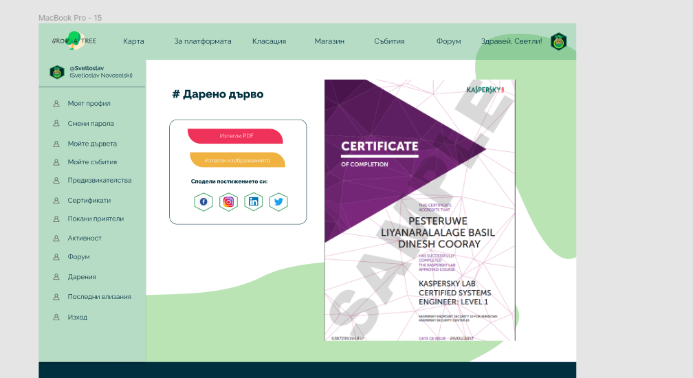 Users should be able to download the certificate into pdf and as a image. Users should be able to share the certificate into social networks.
