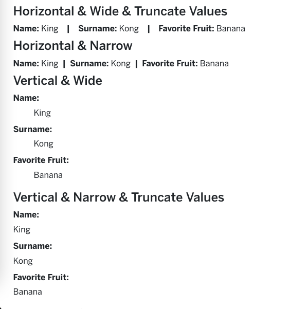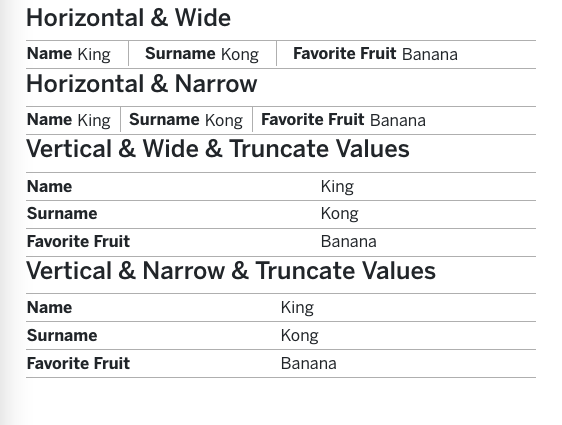 ¹ Truncation for horizontal layout is an edge case because: (a) this layout should be used only when enough space is available; (b) when space is not available, responsive design (styles outside this component) should change the surrounding layout so space is available.