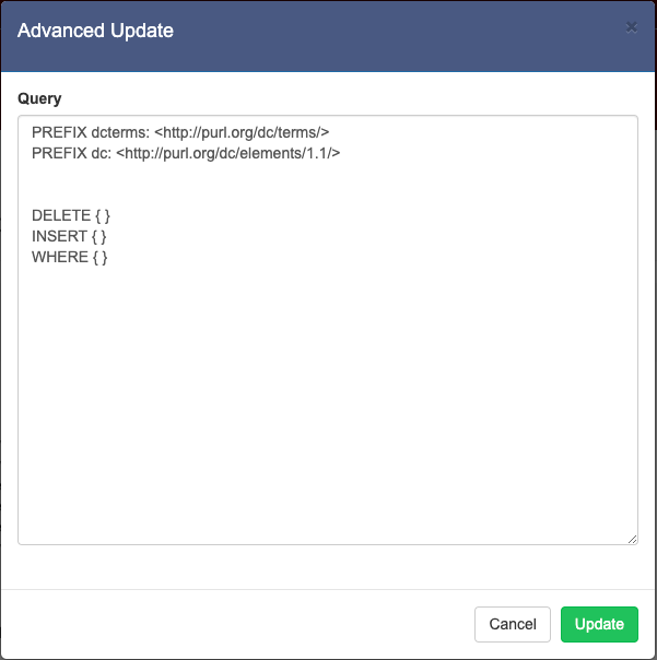 The advanced query action results in the advanced query modal appearing. From this modal you can issue SPRQL queries directly against the IR. It is recommended that this feature be used with caution, as these queries are issued directly, with not validation.