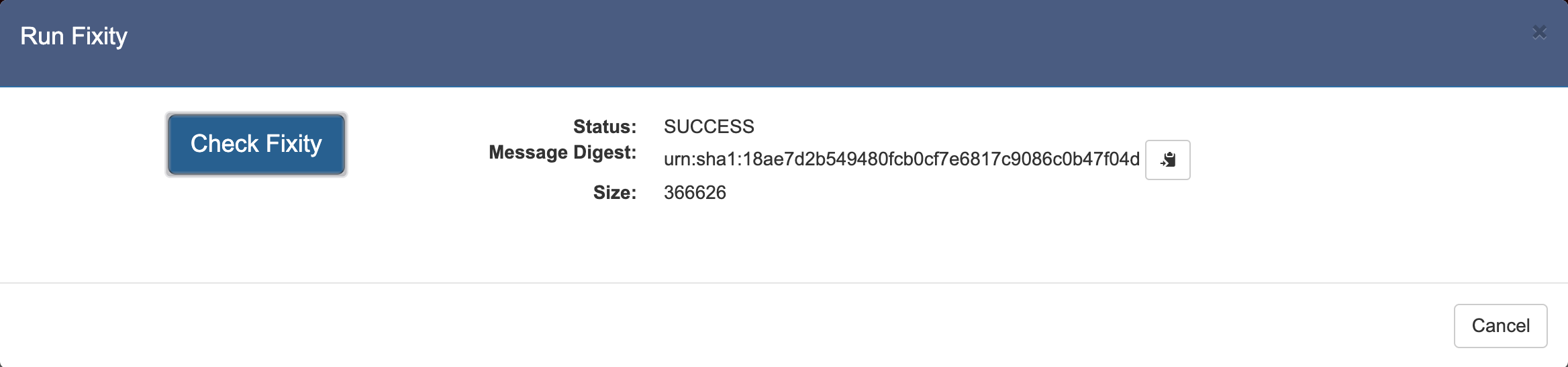 Clicking the fixity action will result in this modal. Clicking the check fixity button will result in a fixity check being run against the resource.