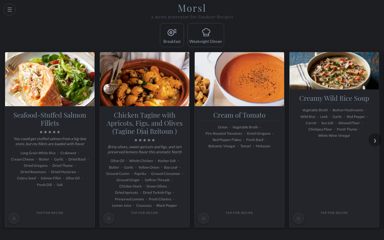 Morsl connects to your Tandoor instance and picks recipes based on rules you set up — keywords, ratings, recipe books, cook history. You create profiles ("Weeknight Dinner" requires the keyword "entree" and prefers 4+ star recipes, "Breakfast" picks 3 tagged breakfast recipes), generate a menu, and share the link. They pick, and you can sync selections back to Tandoor as meal plan entries.
