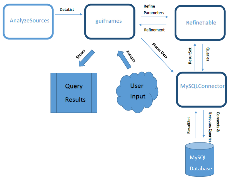 This class is in charge of applying the sorting and filtering on the results as the user entered using the GUI. It receives a "DataList" from AnalyzeSources and stores it in a database - handled by MySQLConnector class, see below - and then executes queries on the database that returns the desired sorting and filtering, and updates the GUI accordingly.