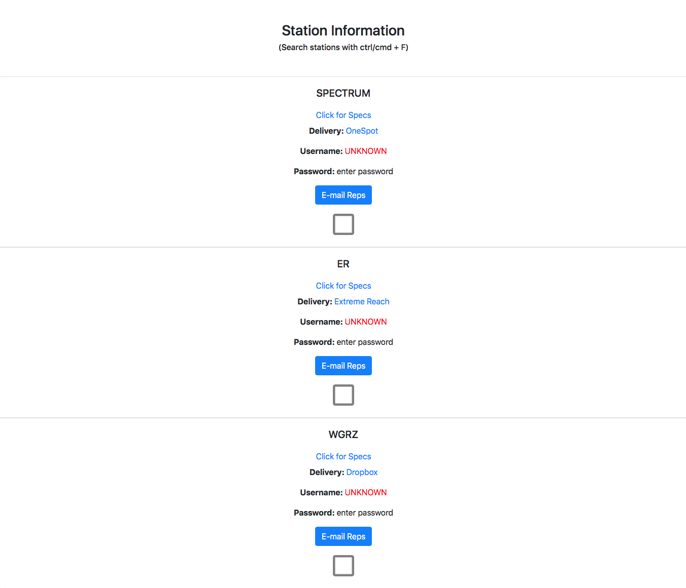 Move down the list and user the Delivery, Username & Password data to quickly get your spots where they need to go.