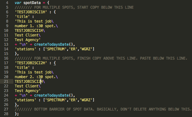 metadata.jsxin your text editor to add the slate data. Inside this file, you will see a variablespotDatawith instructions on how to enter in spot metadata. Here is how this test project should look after all fields are filled (I used a screenshot of my Sublime text editor to make it easier to read. The colored text really helps you to pinpoint any errors you might make entering info, highly recommend!):