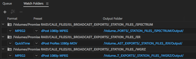 Please note, the final folder destination for these watch folders is <station_name>/Output/. Output/ is generated automatically by Adobe Media Encoder, so all you need to do when you set up your watch folders is: