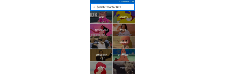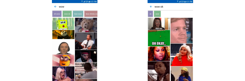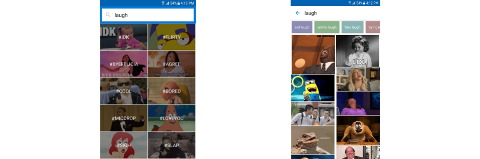- Related Suggestions: Similar to Tags, these are displayed search terms that when clicked on will open a new search. In the demo they appear as related terms to the search, and display above the GIFs in a horizontal scroller.