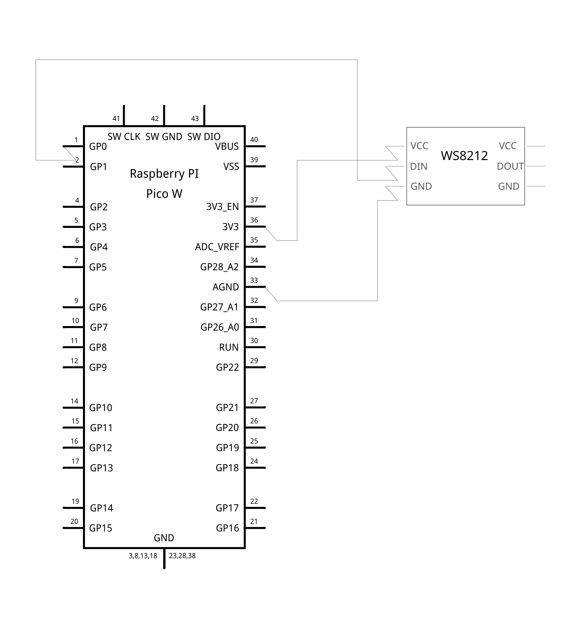 - Finally, solder your lightstrip's power line to the 3.3V pin on the Pico (not the 5V, and definitely not 3V3_EN. Once more, always consult a pinout guide!!). This is because WS2812 lights have a certain tolerance where the data pin must be somewhere around 70% of the power pin's voltage at a minimum, a requirement not satisfied when the lights are connected to the Pico W's 5V output which can lead to weirdly coloured, damaged, or malfunctioning lights.