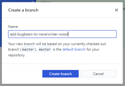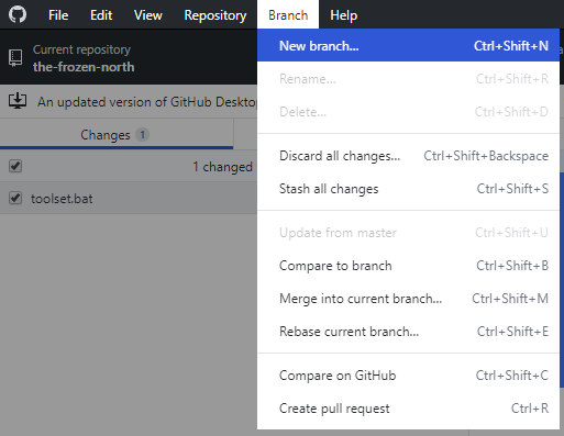 We can group up our changes by making a branch in GitHub Desktop. Do this by going to Branch > New Branch or by pressing Control + Shift + N (Command + Shift + N on a Mac).