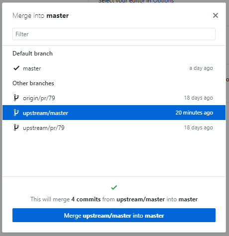 Because the repository you have is a fork, it is not automatically updated or synced with the latest one. Always make sure it is updated before starting a branch. Here's the command to merge the upstream: Branch > Merge into Current Branch, or by pressing Control + Shift + M (Command + Shift + M on a Mac)
