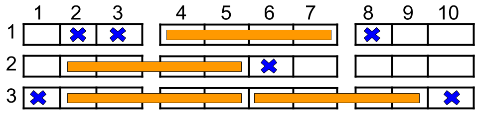 Input: n = 3, reservedSeats = [[1,2],[1,3],[1,8],[2,6],[3,1],[3,10]] Output: 4 Explanation: The figure above shows the optimal allocation for four families, where seats mark with blue are already reserved and contiguous seats mark with orange are for one family.