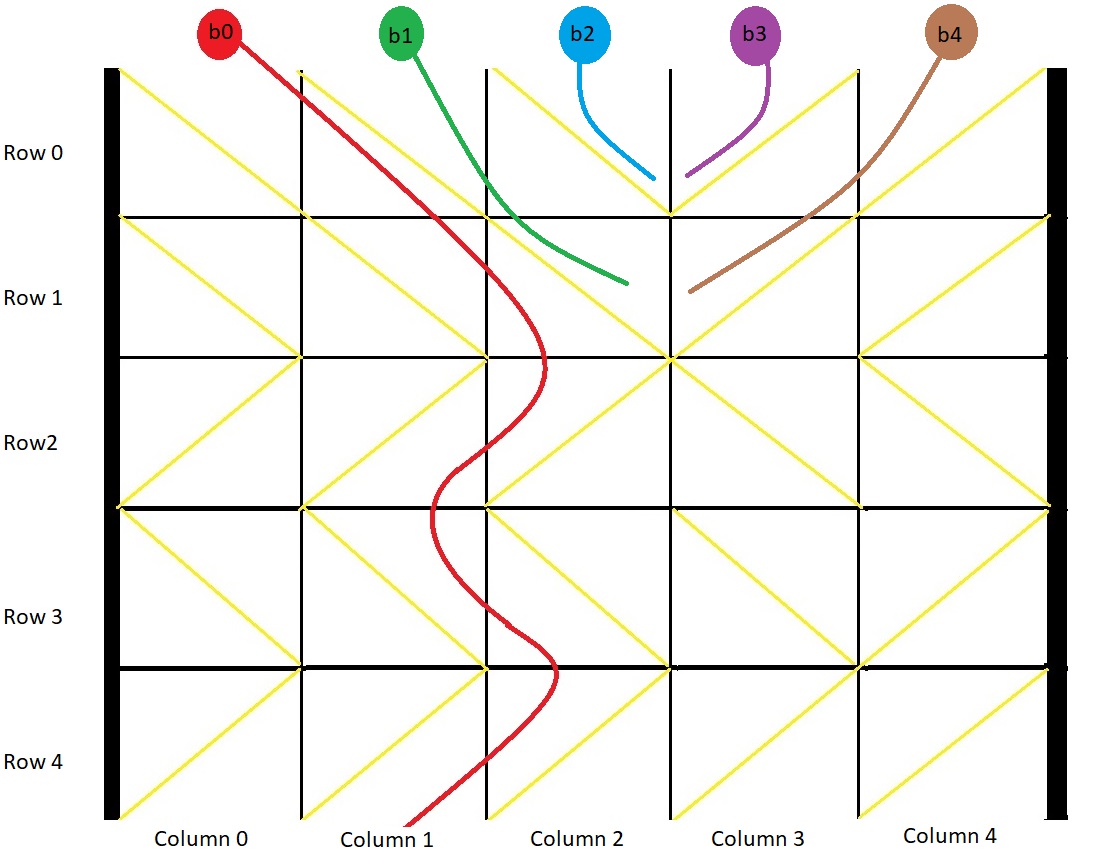 Each cell in the box has a diagonal board spanning two corners of the cell that can redirect a ball to the right or to the left.
