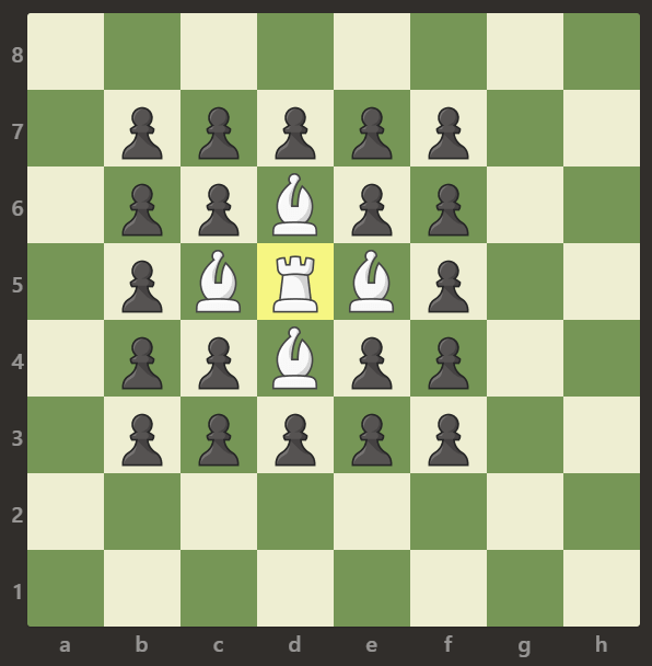 The rook moves as in the rules of Chess: it chooses one of four cardinal directions (north, east, west, and south), then moves in that direction until it chooses to stop, reaches the edge of the board, or captures an opposite colored pawn by moving to the same square it occupies. Also, rooks cannot move into the same square as other friendly bishops.