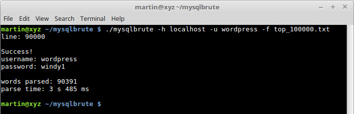 ./mysqlbrute -h localhost -u wordpress -f top_100000.txtDownload a password-only wordlist e.g. Daniel Miessler's (others can be username:password combinations).