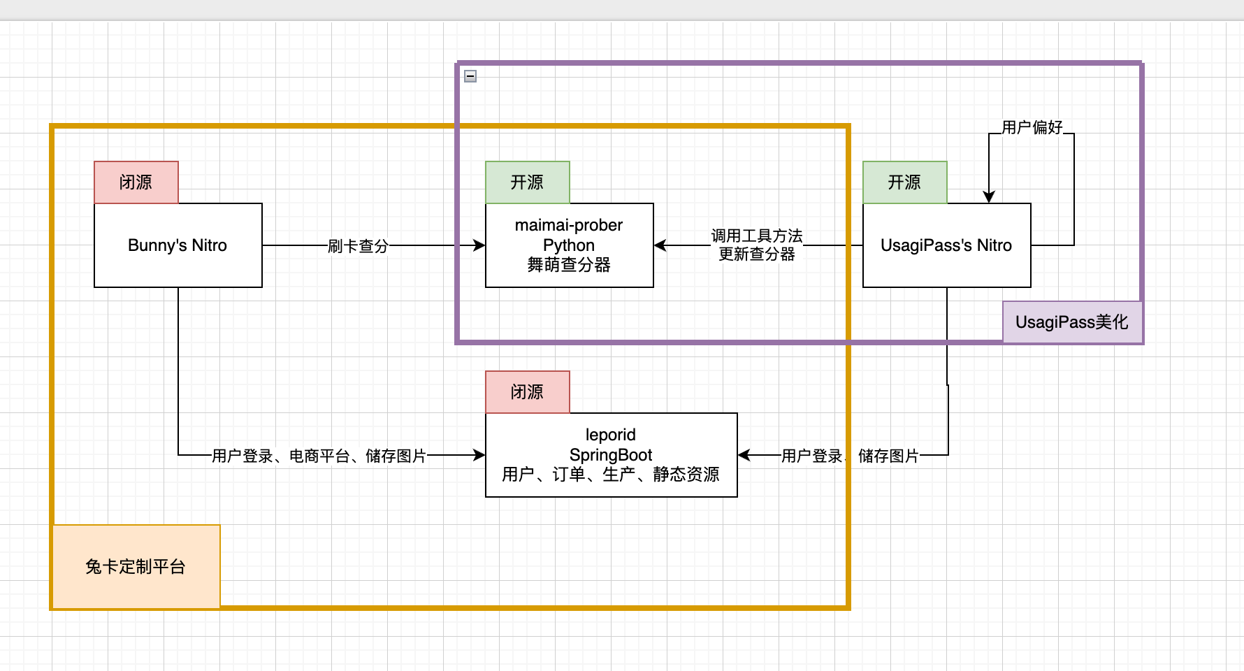 | 45 | +UsagiPass 和 UsagiCard 使用 Nuxt + Nitro SSR 开发,Nitro 负责承载部分业务,以及转发 leporid 和 otoge-service 提供的 API 服务。 |
