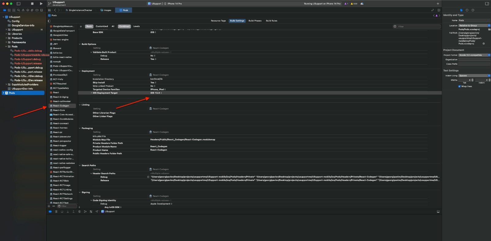 On the pane that appears find the React-Codegen Pod and click on it