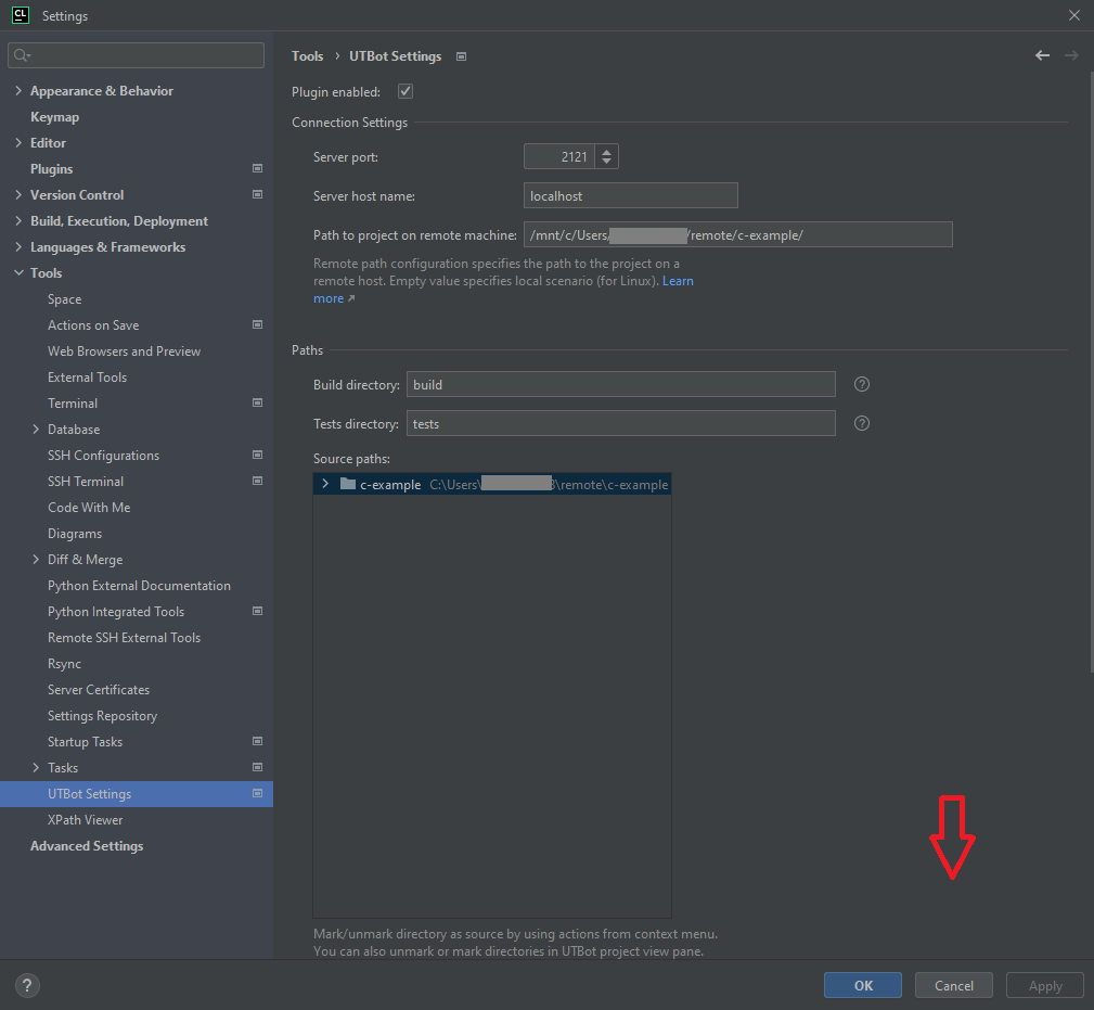 Path to project on remote machine: /home/utbot/remote/c-example The relative path to your project on the server host.