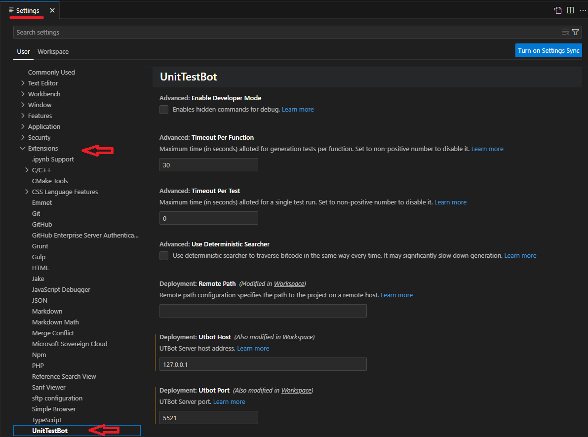 Go to File > Preferences > Settings and navigate to Extensions > UnitTestBot.