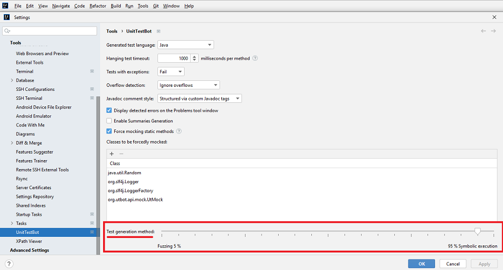 In the Generate Tests with UnitTestBot window you can set the timeout for both the fuzzing process and the symbolic engine to generate tests for a given class.