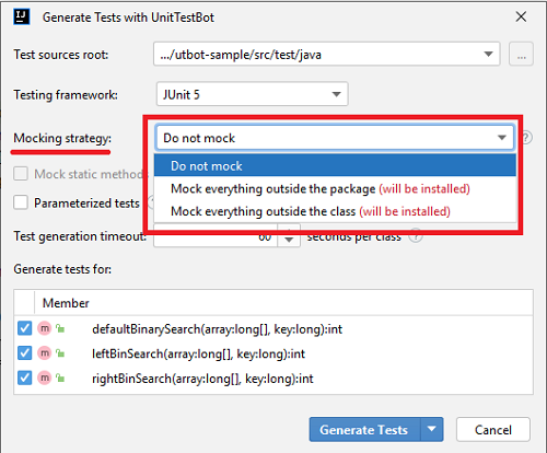 In the Generate Tests with UnitTestBot window choose your Mocking strategy: