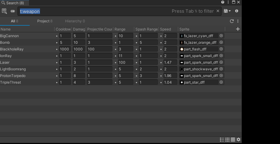 But what is best is that you can now create table for any kind of objects. Imagine your game has a Weapon Scriptable object that stores all weapons statistic and icon.
