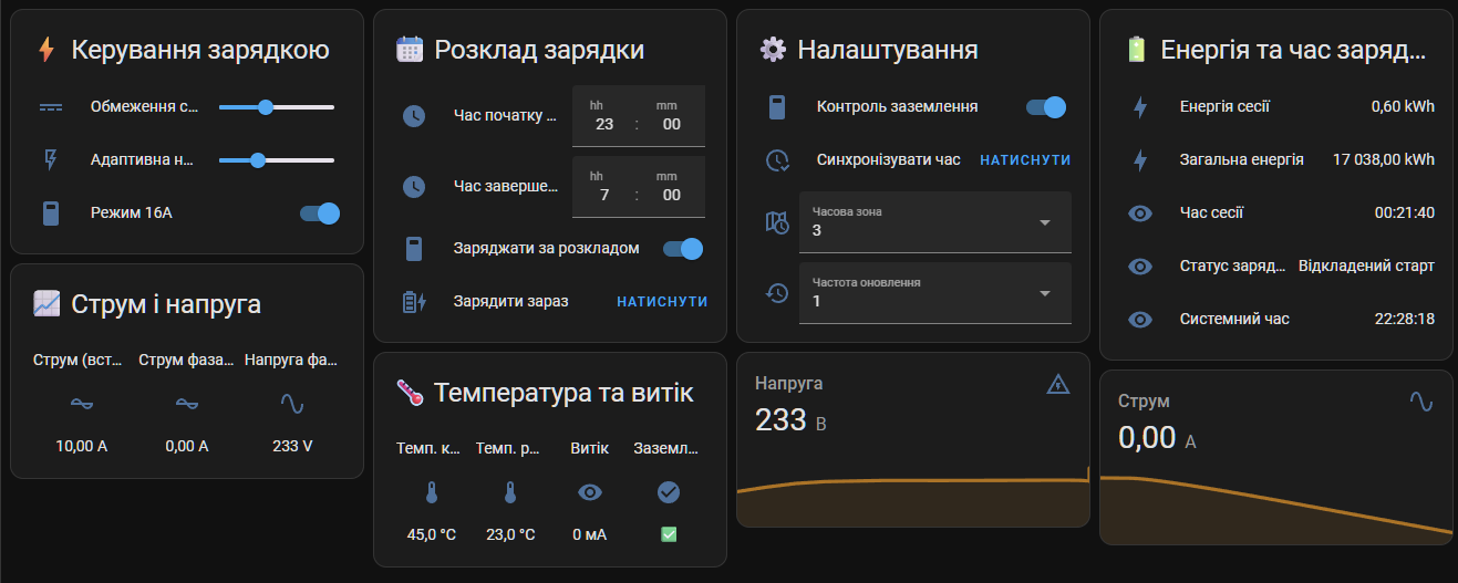 sensor— станція, напруга, струм, потужність, температура, енергіяswitch— перемикач режиму, заземлення, розкладnumber— обмеження струму/напругиbutton— ручний запуск зарядки, синхронізація часуselect— вибір часової зони