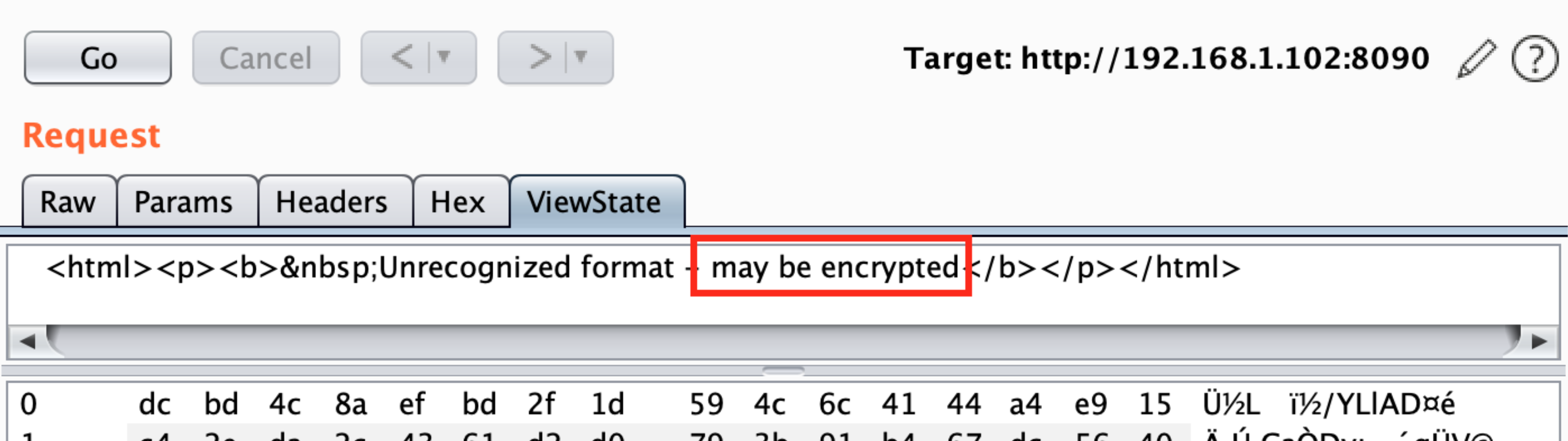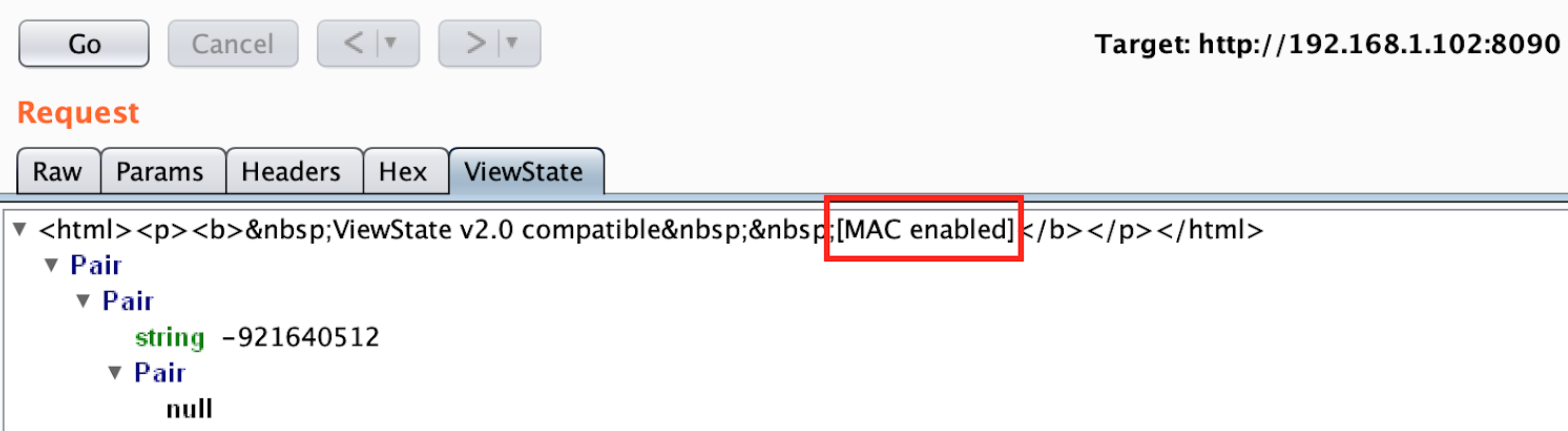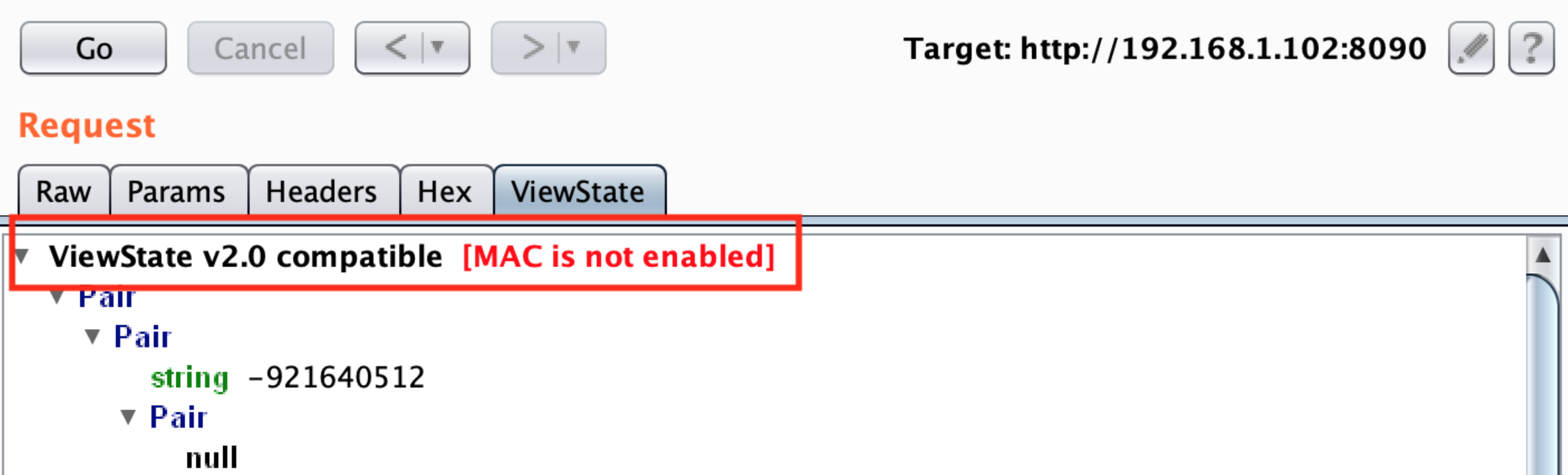 --apppath="/" --path="/hello.aspx"In this case Burp doesn't find if the parameter is protected with MAC because it doesn't recognise the values. Then, the value is probably encrypted and you will need the Machine Key to encrypt your payload to exploit the vulnerability.