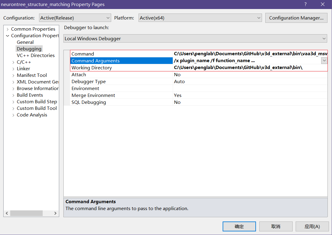 - add Vaa3D executable path to "Command". e.g.: C:\Users\penglab\Documents\GitHub\v3d_external\bin\vaa3d_msvc.exe