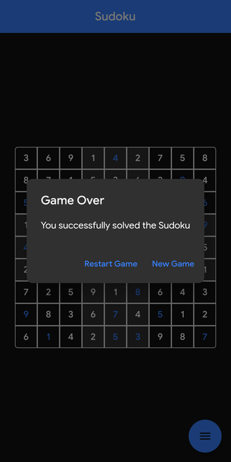After completely solving the grid, if the solution is correct it will alert you that you successfully solved the Sudoku