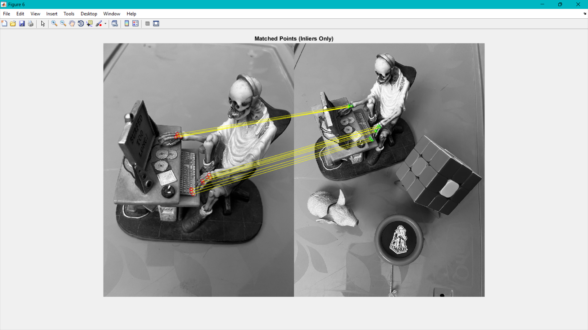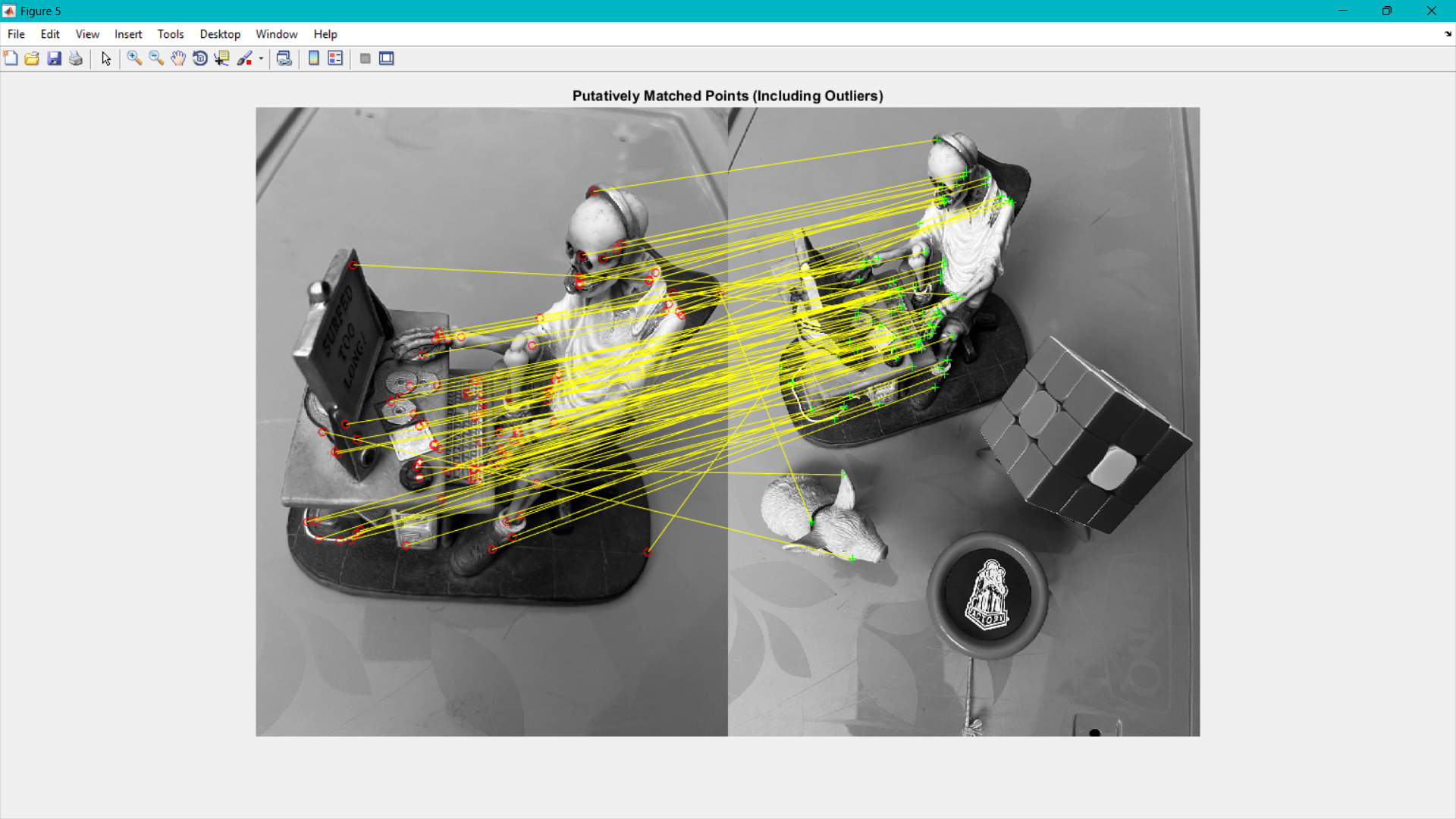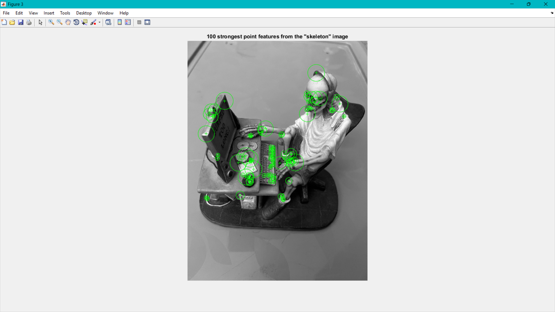 The detectSURFFeatures() functions are used to detect the points of interest in the two datasets (skeletonImage and allImage).