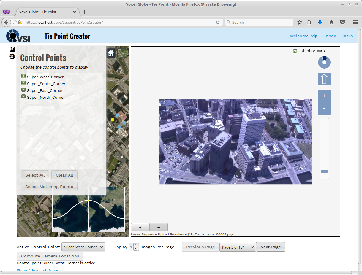 Notice in the Cesium Map, yellow and blue circles start appearing. Yellow objects represet the currently "Active Control Point", identified in the lower left corner where it says "Super_West_Corner". The active control point can be changed by clicking on a blue dot or blue ring. Also the "Active Control Point" drop down box in the lower left corner can be used to designate the active control point.