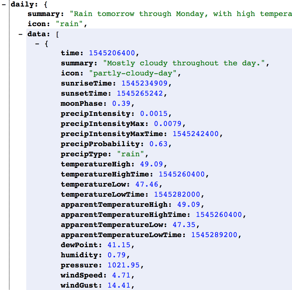 You have the current temperature printing out for any location a user can come up with. Cool! But DarkSky gives you so much more data than just that!
