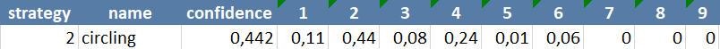 The most important metrics we wanted to extract from the raw data were the strategy usages and how they differ between Strains, Age groups, Housing and all combinations of those. Therefore we once again used RTrack to predict the strategies used by the mice for each Trial. For each Trial we computed one of these tables, where the called strategy plus the confidence for all strategies are shown.