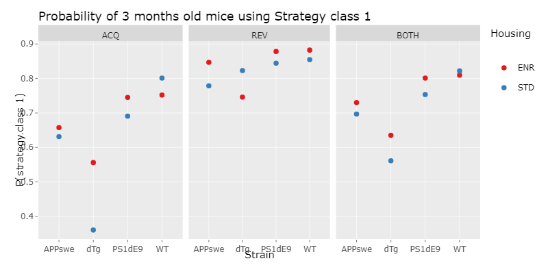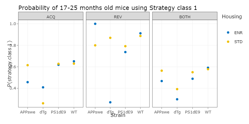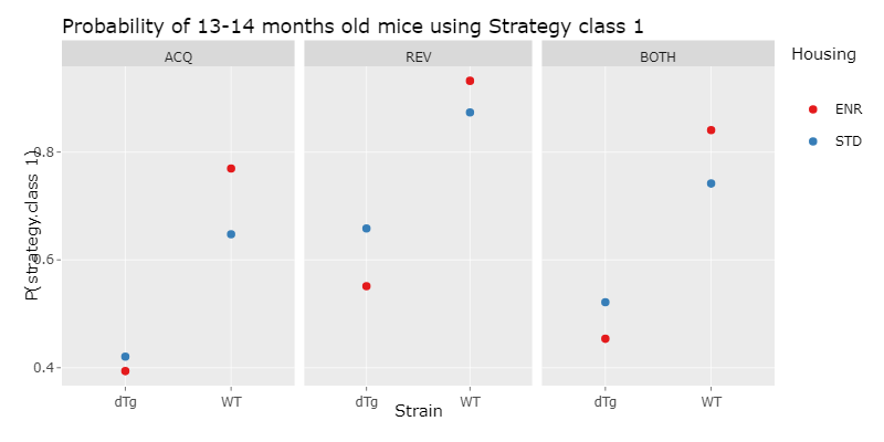 We´ve then done a logistic regression, which is a statistical model for a regression analysis. To do this, we first applied different logistic regression models with increasing complexity to our data and compared them using the ANOVA function. With this we choose the minimal adequate model, which is the simplest model, that describes the data appropiatly. With this model, we then could compute a prediction, which is the propability of a mouse of a specific experiment paradigm, choosing strategy class 1 and therefore using a hippocampus dependent strategy.