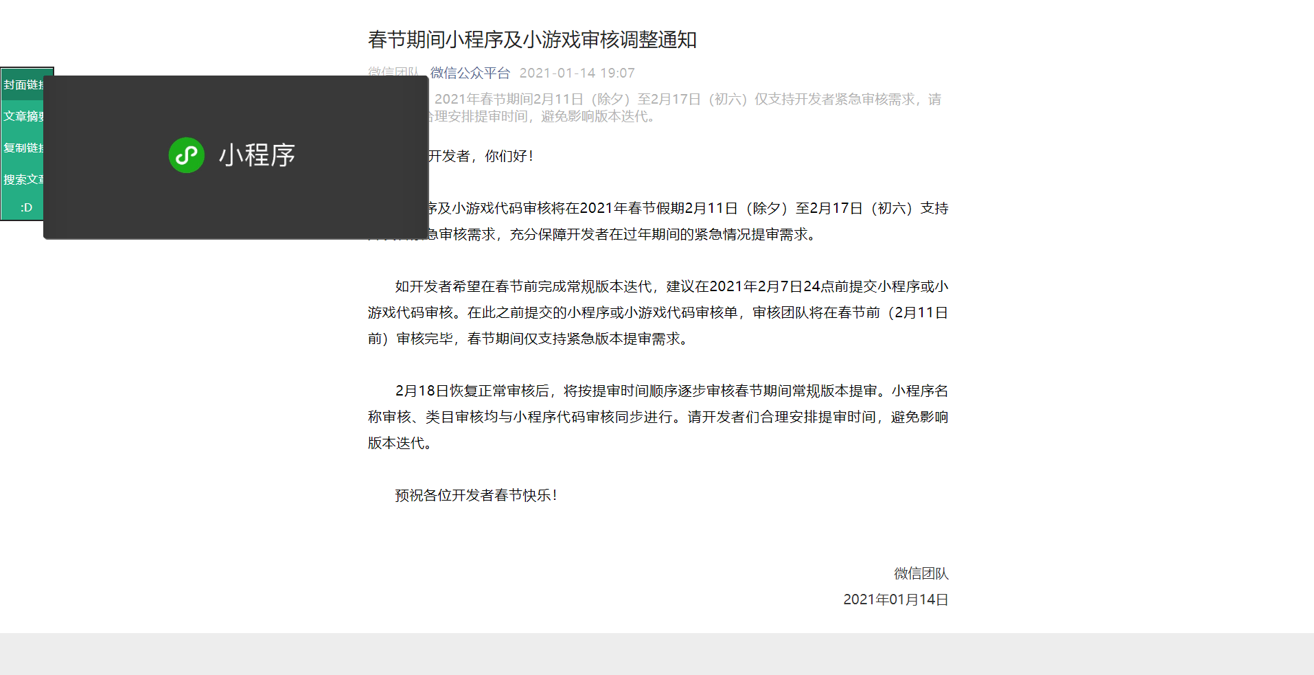 ESC临时显示/隐藏菜单确保脚本在脚本管理器中处于启用状态,在浏览器中随意打开一篇推送,例:春节期间小程序及小游戏审核调整通知。