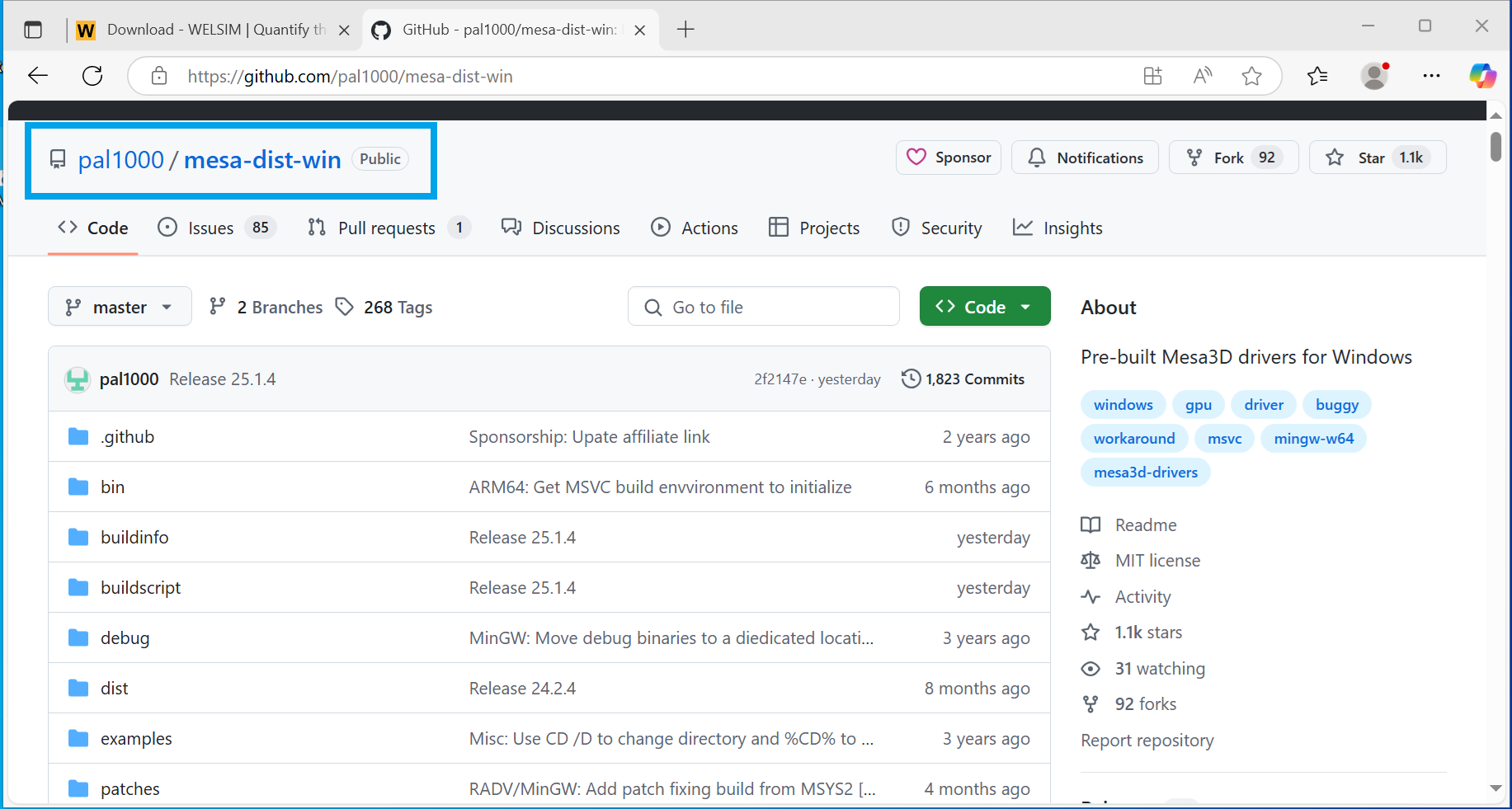 1.Download the Mesa OpenGL library from GitHub. The project name is mesa-dist-win.