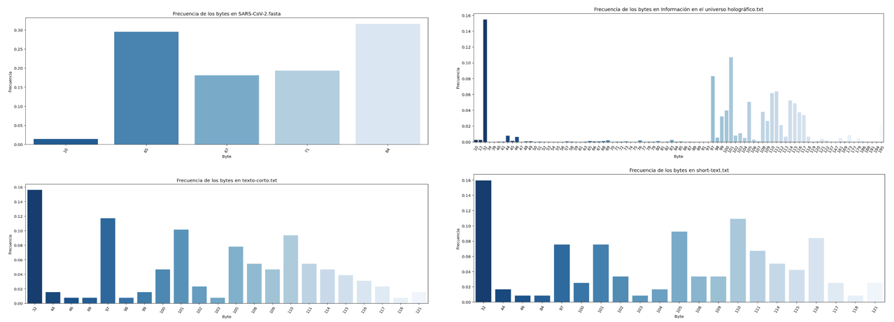 The Graphs with the distribution of symbols of each file are shown below. In most cases and because the content of some files is in natural language, Benford's law can be observed, there is a large amount of information accumulated in bytes that begin with the number 1, it can also be observed that there is a large amount of information accumulated in three-digit bytes, for .fasta files it can be observed the presence of a very short alphabet and special symbols that are related to the structure file standard, the last table in this section shows a numerical summary of the entropy analysis of each file, the necessary bytes and gain columns are related to the following formulas consecutively