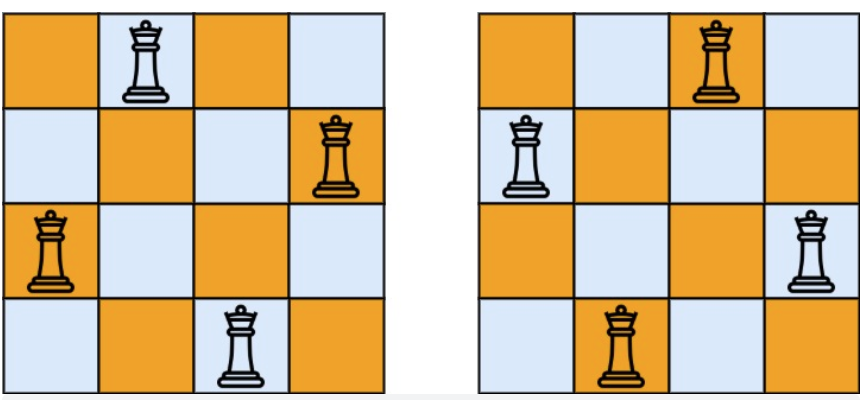 - 解释:如上图所示,4 皇后问题存在两个不同的解法。
