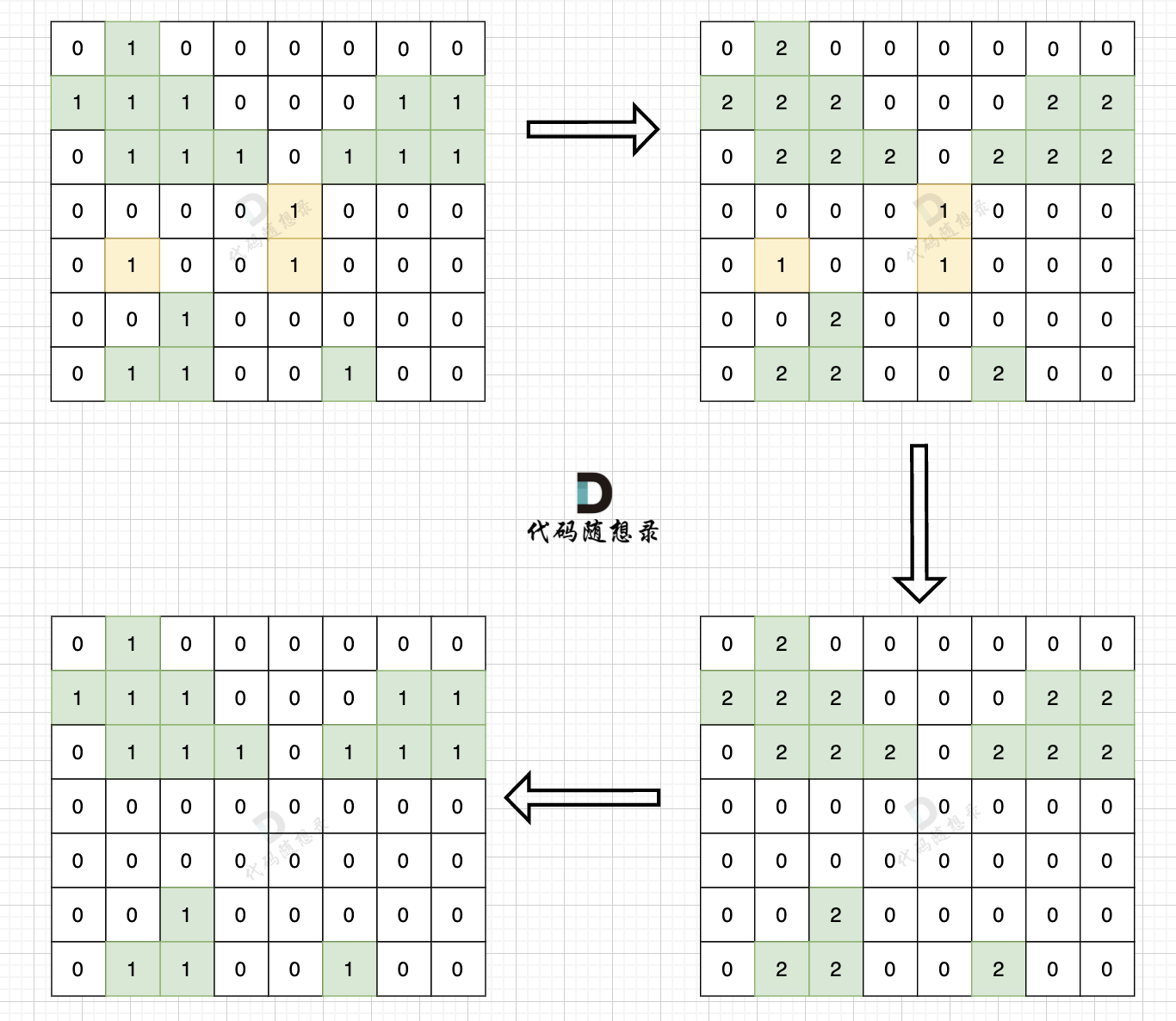 有的录友可能想,我再定义一个 visited 二维数组,单独标记周边的陆地,然后遍历地图的时候同时对 地图数组 和 数组visited 进行判断,决定 陆地是否变成水域。